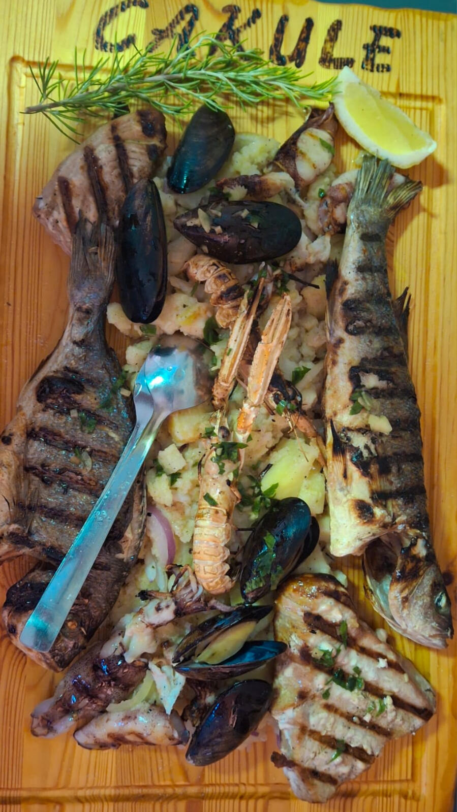 Piatto di pesce per due con contorno (Branzino, Orata, Gamberi, Calamari, Tonno, Cozze) – €58,00SPECIALITÀ DI PESCE DELLA CASA
