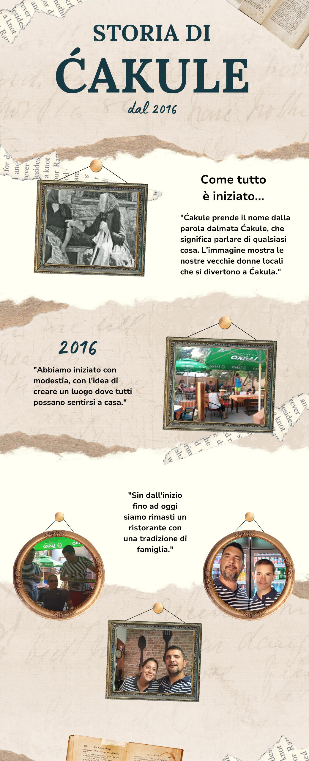 Perché Ćakule è un luogo dove lo spirito dalmata vive al massimo?A Ćakule ogni pasto è un'opportunità per sperimentare il vero stile di vita dalmata. I nostri piatti riflettono la semplicità e la ricchezza della Dalmazia - dagli ingredienti freschi e locali agli ingredienti stagionali preparati con amore per la tradizione.Ma ciò che ci distingue è il calore e l’unione che si avvertono ad ogni pasto. Che si tratti di un lungo pranzo con la famiglia o di una serata con gli amici, Ćakule è un posto dove tutti si sentono a casa. Risate, racconti e un'atmosfera rilassata rendono speciale ogni momento, creando un'esperienza indimenticabile che vorrai ripetere.